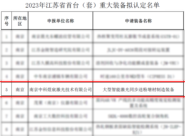 2023年9月4日,江蘇省工信廳對(duì)《2023年江蘇省首臺(tái)(套)重大裝備擬認(rèn)定名單》予以公示。中科煜宸的“大型智能激光同步送粉增材制造裝備”被認(rèn)定為江蘇省首臺(tái)套產(chǎn)品。(2018年,中科煜宸LDM8060金屬增材制造裝備獲江蘇省首臺(tái)套裝備認(rèn)定。)