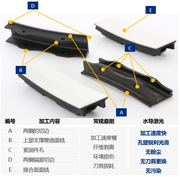 RJ505水導(dǎo)激光加工機(jī)床憑借其強(qiáng)大的激光能量和水冷卻特性,能夠有效避免過(guò)熱和氣孔等缺陷,提供更高的切割精度和加工質(zhì)量,從而顯著提升汽車制造業(yè)中復(fù)合材料零部件的生產(chǎn)效率和質(zhì)量。
