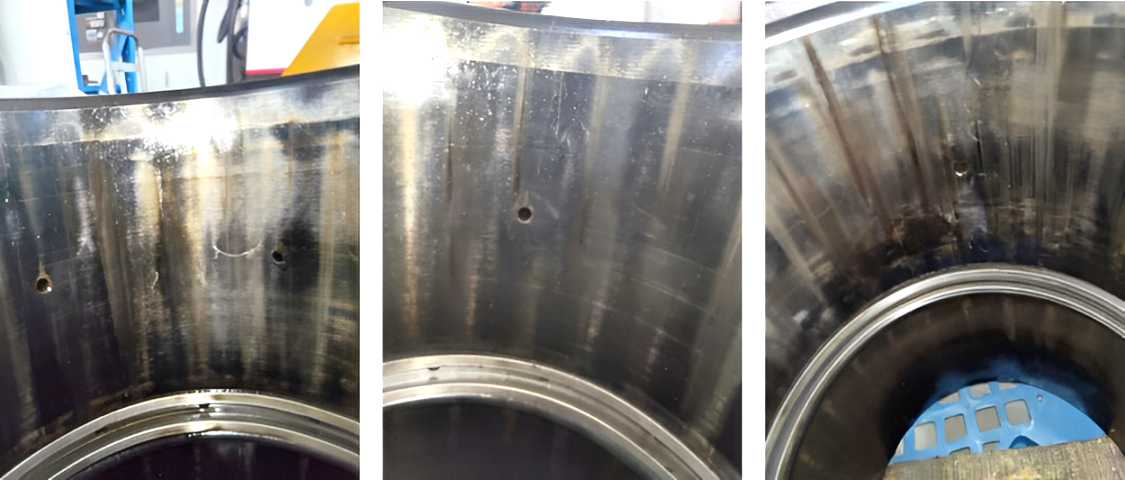 中科煜宸優(yōu)選滿足工藝要求的合金粉末用于行星架軸徑工作面激光熔覆。對于尺寸缺失較多的行星架,采取層間冷卻多次熔覆方式嚴(yán)格控制質(zhì)量缺陷以滿足熔覆層尺寸要求,外觀及探傷檢測無裂紋、夾雜、氣孔、未熔合等缺陷。